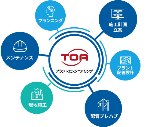TOP 事業内容 PLANT-ENGINEERING事業内容 プランニングから設計・プレハブ・施工・メンテナンスまで一貫施工 東亜工業は、合理的一貫施工方式を採用し、低コスト化、品質安定化、工期大幅短縮化を追求しています。またメンテナンスにおいても、プラントの生産効率向上に努めています。 プランニング 高品質、短納期、低コストに挑戦するマスタープランの作成 施工計画立案 豊富なデータに基づく緻密な施工管理計画の立案 プラント配管設計 3D-CADを活用した高精度のプラント配管設計 配管プレハブ 高品質、短納期、低コストに挑戦するパイプ・プレハブ 現地施工 データを駆使した現地施工管理 メンテナンス 設備の安定・安全に繋げるメンテナンス